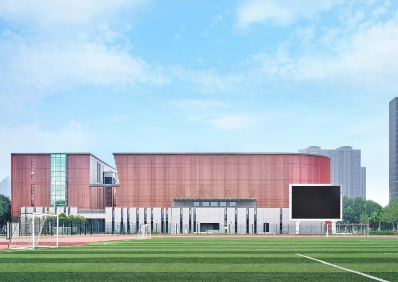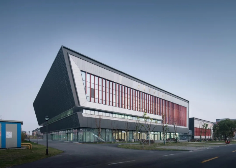 體育館為新建建筑,訓(xùn)練館利用保留的實(shí)訓(xùn)樓。兩者通過(guò)二層室外大平臺(tái)相連并組織觀眾主要交通,北側(cè)緊鄰400米標(biāo)準(zhǔn)運(yùn)動(dòng)場(chǎng)及室外運(yùn)動(dòng)場(chǎng)地。體育館總建筑面積11639.98平方米,其中地上10761.39平方米,地下878.59平方米,建筑總高度21.50米。