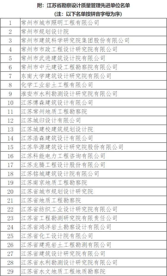 關(guān)于公布表彰“江蘇省勘察設(shè)計(jì)質(zhì)量管理先進(jìn)單位”的通知