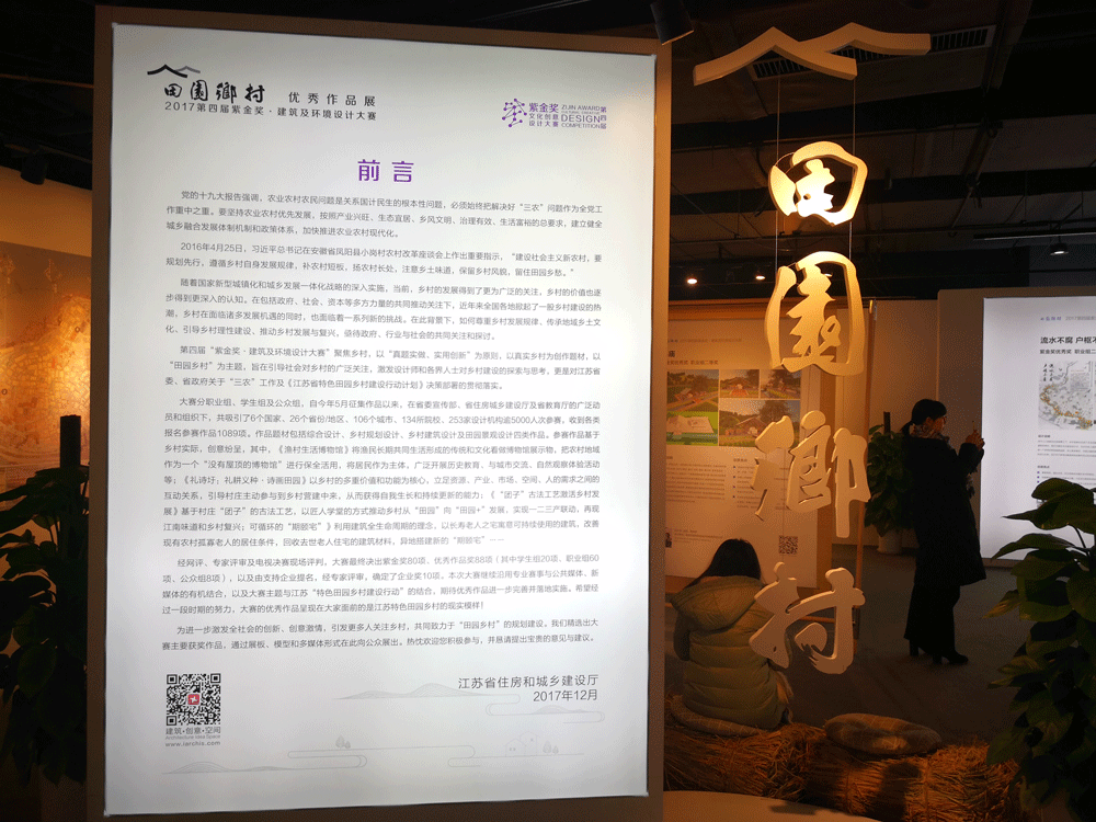 12月19日下午,我院9位同事前往南京市紫金文創(chuàng)園,參觀由江蘇省住房和城鄉(xiāng)建設(shè)廳舉辦的“田園鄉(xiāng)村-優(yōu)秀作品展”暨“2017第四屆‘紫金獎(jiǎng)’文化創(chuàng)意設(shè)計(jì)大賽作品展”。此次紫金獎(jiǎng)設(shè)計(jì)大賽南大建筑眾參賽項(xiàng)目表現(xiàn)優(yōu)異,并最終取得職業(yè)組1金1銀2銅的好成績(jī)。