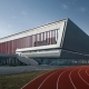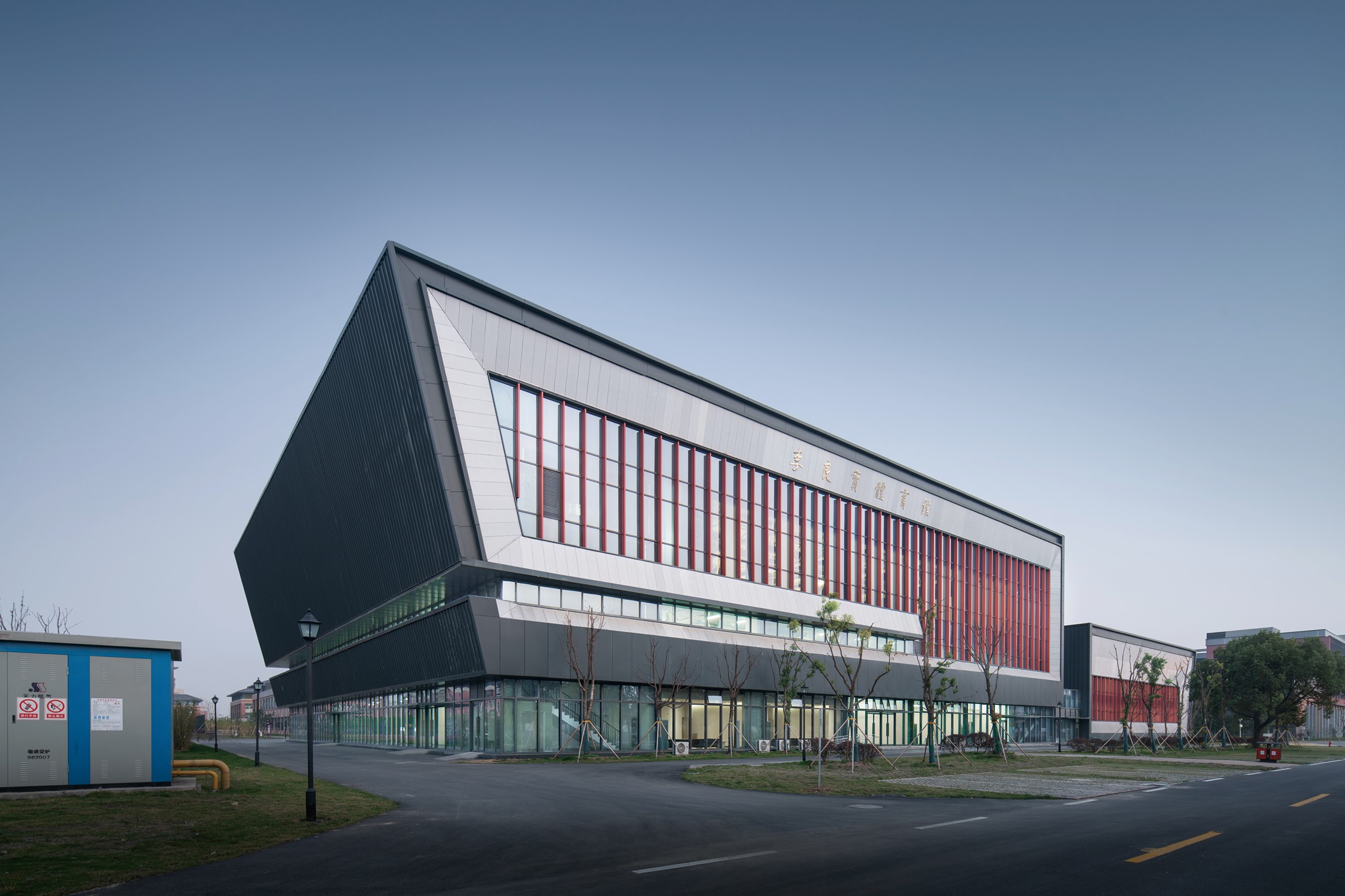 體育館為新建建筑,訓練館利用保留的實訓樓。兩者通過二層室外大平臺相連并組織觀眾主要交通,北側緊鄰400米標準運動場及室外運動場地。體育館總建筑面積11639.98平方米,其中地上10761.39平方米,地下878.59平方米,建筑總高度21.50米。