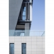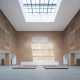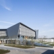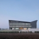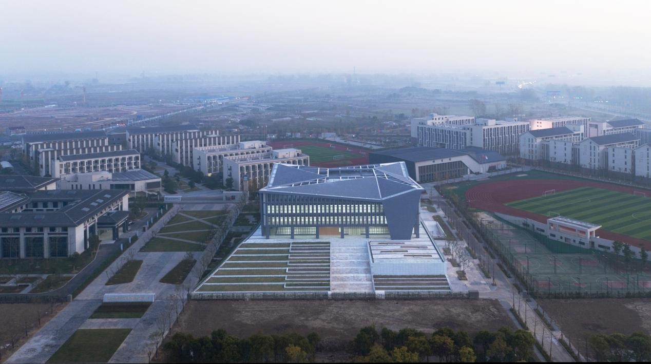 項(xiàng)目所在的濱河新城教育中心整體規(guī)劃為一個(gè)校園,包含圖書館、黨校、初中和小學(xué)。圖書館與黨校分立與校園景觀主軸兩側(cè),南側(cè)臨城市主要道路,作為校園的標(biāo)志性建筑,設(shè)計(jì)體現(xiàn)兩個(gè)方面的意圖,其一是教育中心形象展示,其二是圖書閱覽資源社會(huì)共享。建筑首層擴(kuò)大形成基座,南向臺(tái)階結(jié)合層層跌落的花壇向城市干道延伸,并與綠化帶銜接,營造開放的主入口形象。東南側(cè)插入報(bào)告廳體量形成觀景平臺(tái)。西側(cè)朝向校園南北主軸線,與黨校主入口相對(duì)而立,以優(yōu)雅親和的弧形界面圍合日常進(jìn)出的次入口廣場。自南側(cè)入口廣場拾階而上,穿過柱廊進(jìn)入二層中庭,二至四層閱覽功能圍繞中庭形成基座之上的方形體量,冠以四足鼎立的折板屋面,呼應(yīng)地域傳統(tǒng)“四水歸堂”的造型轉(zhuǎn)換,詮釋當(dāng)代“淮陽風(fēng)格”。建筑基座采用淺灰色石材,主體采用深灰鋁板和石材,外掛亮銀色穿孔鋁板遮陽。局部入口區(qū)域采用木紋鋁板點(diǎn)綴,形成標(biāo)識(shí)并呼應(yīng)內(nèi)裝材質(zhì)。內(nèi)裝設(shè)計(jì)以木色為主,中性色為輔,局部點(diǎn)綴明亮活潑的樓層色,營造親切自然的閱覽學(xué)習(xí)空間。