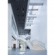 大氣科學(xué)樓以各院系為基本的組成單位,以內(nèi)院為核心構(gòu)成院落單元。院系以建筑單元劃分,使各個院系單元組合既相對獨(dú)立又聯(lián)成一體。建筑分為四個區(qū),由西北側(cè)體塊、南側(cè)體塊組成科研區(qū)單元,東北側(cè)體塊組成公共單元。其中東北側(cè)的公共單元在室內(nèi)空間的營造方面進(jìn)行了精心設(shè)計(jì)。公共單元里主要是大會議室和圖書館功能,這兩種功能需要的空間要比普通科研教學(xué)用房高,建筑師把這兩種空間作為一個單元單獨(dú)疊加設(shè)計(jì),再利用和其他三個科研教學(xué)單元的層高差別,用室內(nèi)樓梯連接半層空間,這樣不僅避免了不同使用高度的空間在同一單元引起的空間浪費(fèi),還營造出了一個立體豐富的中庭共享空間。如今這個共享空間已經(jīng)成為大氣樓師生們最喜歡駐足的地方,也成為了大氣樓和其他院系樓有區(qū)別的標(biāo)志性空間。中庭和圖書室分別設(shè)置了屋頂采光天窗,在白天很好的改善了室內(nèi)天然采光效果。本建筑還利用平面布局懸挑營造出了凸凹有致的立體效果,這些立面上的懸挑也起到了互遮陽和建筑自遮陽的作用,減少了墻面得熱。大氣科學(xué)樓立面以淺灰色面磚為主,穿插深灰色面磚體塊,整體造型結(jié)合平面功能,利用平面布局懸挑營造出了凸凹有致的立體效果,穩(wěn)重大氣獨(dú)特的造型,在南京大學(xué)仙林校區(qū)已經(jīng)建成的系科樓里獨(dú)樹一幟,贏得了師生們的一致好評。