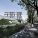 項目位于城市和校園的交界,北側(cè)文瀾路是仙林大學城創(chuàng)新創(chuàng)業(yè)街區(qū),東側(cè)臨城市道路,西側(cè)是實訓樓?;貞@和城市區(qū)位,設計意圖營造一個學城共享,促進交往,富有歸屬感的“創(chuàng)客街區(qū)”,為校園師生搭建工作、學習、分享、交流、合作的平臺。建筑主體成條形布置,北側(cè)廣場向城市開放,南側(cè)為內(nèi)部使用的地面停車場,東南角設置配電房,結(jié)合校園東門做景觀化處理。建筑首二層“平臺”沿道路形成連續(xù)的界面,三到五層分為三個方形體量,與西側(cè)實訓中心界面基本守齊,形成呼應關系;體量左右錯動呼應道路斜線以及現(xiàn)有建筑的輪廓關系。首層北端布置環(huán)形的創(chuàng)業(yè)講堂,靠近建筑門廳;中央無立面采光的區(qū)域設置會議研討室以及交往空間,木質(zhì)的格柵營造溫馨的休閑氛圍,螺旋樓梯聯(lián)系二層,利用可以自動感應開啟的天窗引入陽光和空氣,體現(xiàn)氣候適應性建筑的設計理念。建筑立面利用塔樓方形單元懸挑產(chǎn)生體量穿插和光影變化,在大面處理上運用材料、色彩、凹凸、細部、線條劃分等造型因素,營造活潑、明快、簡潔的校園建筑形象。